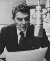(LA4)Hollywood, Jan.9--RONALD REAGAN, RADIO COMMENTATOR--Ronald Reagan, who this week ended eight years as governor of California, launches his new part-time career--a series of 10 five-minute broadcasts which will be aired over 160 radio stations, starting Jan. 20. He said the broadcasts are not a presidential campaign vehicle, but a means of getting his views on big government to the people. (AP Wirephoto)