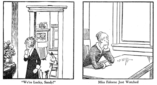 "A person'd think you had some inside dope on this, Sandy! You sit there, watchin' th' road as if you knew somethin' was goin' to happen and happen soon! Gee! I hope it does! I can't for th' life o' me figger out what's keepin' him! He's just got to come home, Sandy. What's th' good o' this apple business if Mrs. Falorne stays so sadlike?"