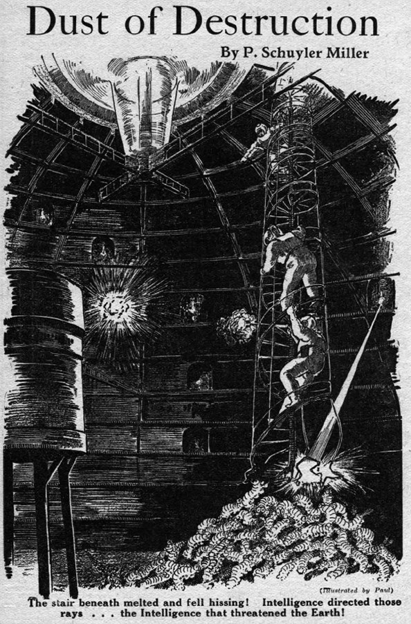 Slowly we toiled up the wisp of metal that wound up and up into the hollow heart of the peak—up to the great cathode ray and the unseen things that guarded it. Slowly Red followed, covering our retreat. A sudden ray blazed, searing the stair between us. As the lower steps sagged, he launched upward in a mighty leap, wormed to safety, and fired at the niche from which the ray had come. A dim, half-seen shape squirmed erect with a queer, chirping cry—a thing seemingly unlike the things below, larger, differently shaped, more—human! Or was it a shadow-distorted insect, some larger, more advanced form, like the rulers of the termitary, that rose and toppled into the seething cauldron beneath?