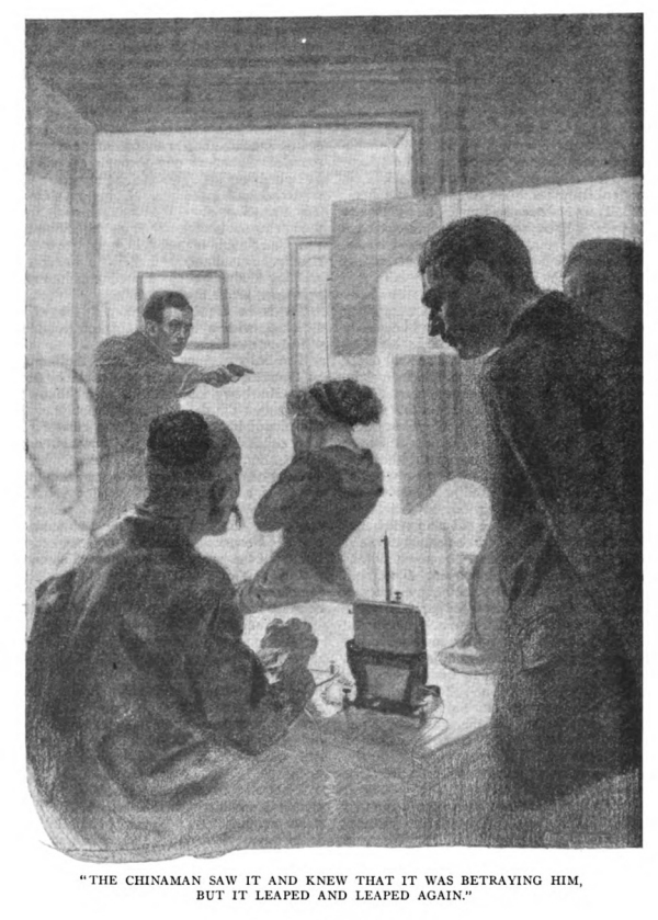 "I see—I see!" exclaimed the crest-fallen detective. "But if it was a Chinaman, then, even with that thing," he pointed to the instrument Trant had just finished arranging, "you'll never get the truth out of him. You can't get anything out of a Chinaman! Inspector Walker will tell you that!"